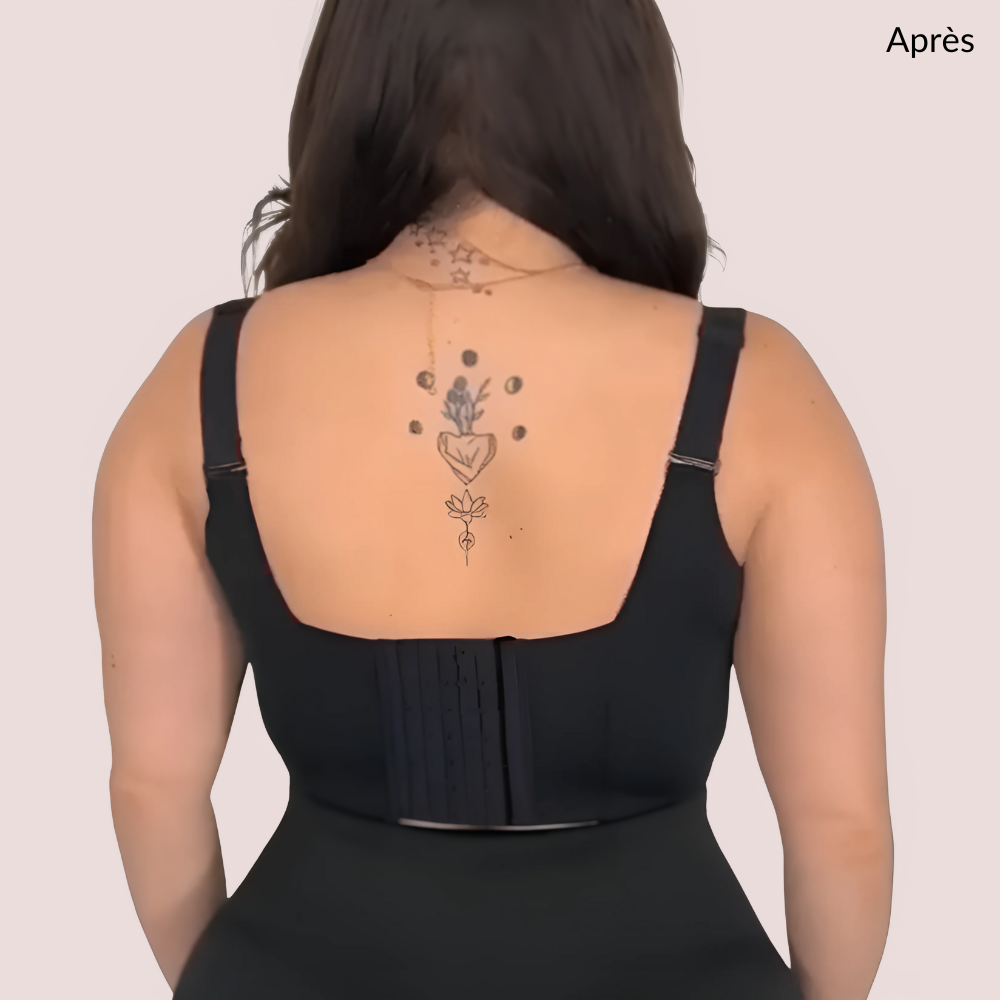 Dos : Large bande dorsale lissante (3 à 4 agrafes) pour effacer les bourrelets.